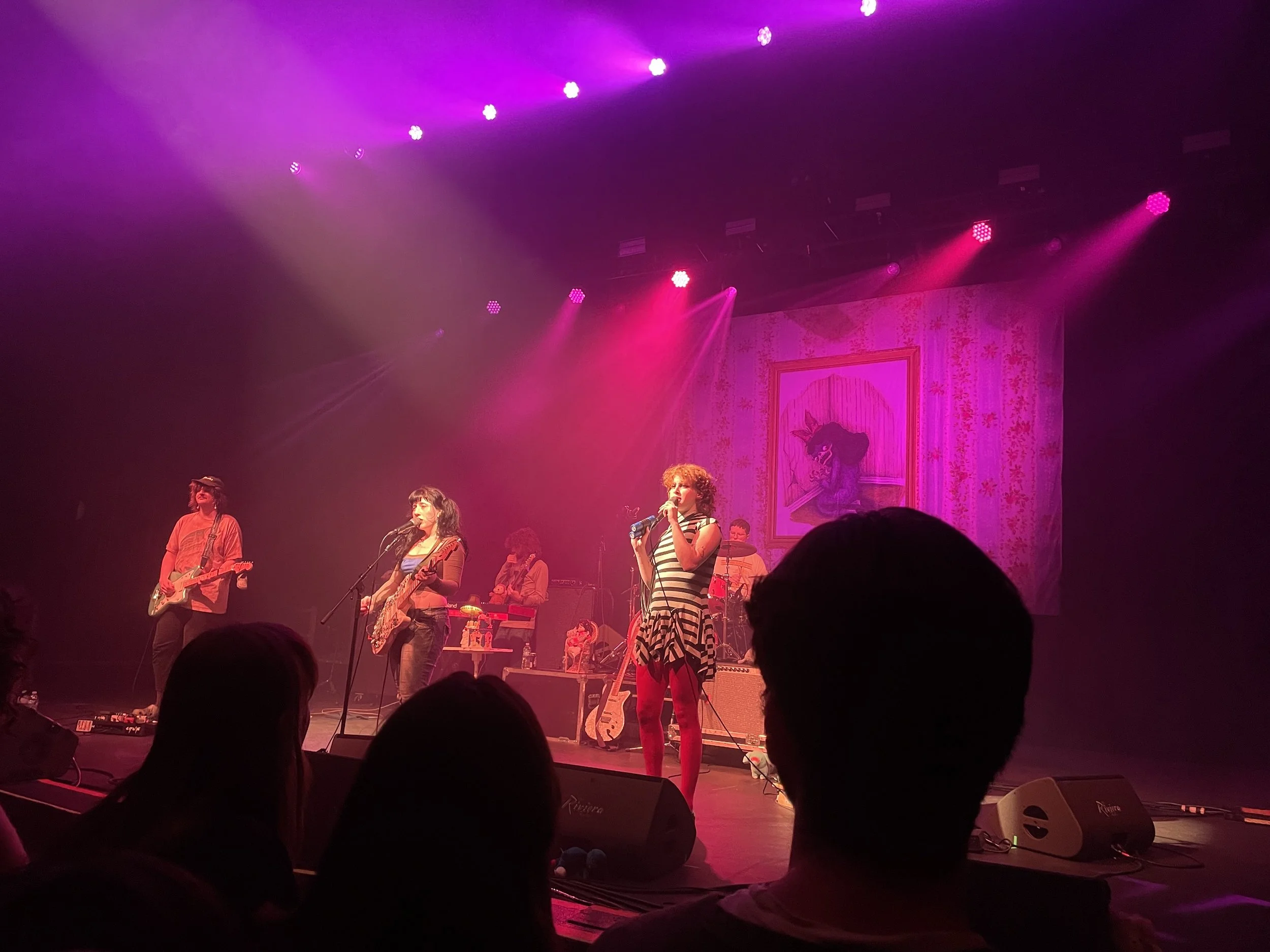 On Monday night, the Rivieria Theatre’s ornate showroom was submerged in fog. Bright purple lights bounced off the golden fixtures adorning the walls. The stage was a sight to behold; accompanying the six electric guitars propped in the center was a variety of dolls. Some were ominous and vintage-looking, while others were imitations of popular children’s characters, like Pete the Cat. A backdrop with the Maurice Sendak-esque creature featured on the cover of Wednesday’s new album, Bleeds (created by artist Kamila Mlynarczyk), hung from the ceiling.